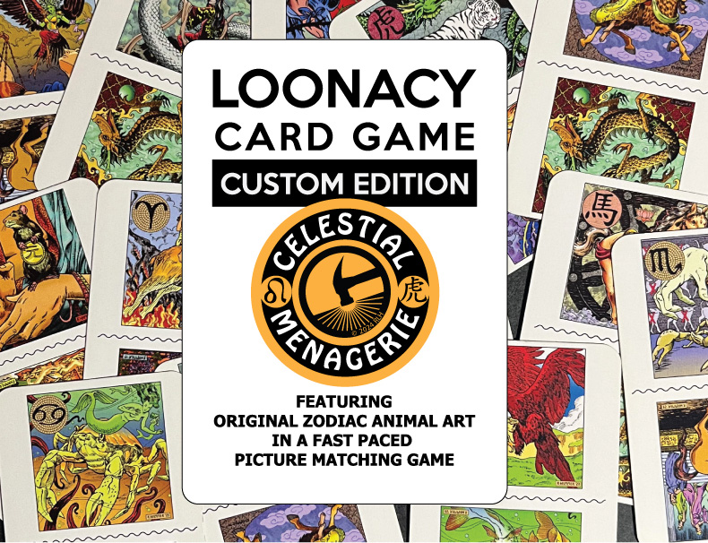 Loonacy Card Games offer a printed custom deck featuring original art of the customer. In this case I provided art from my Chinese and western Zodiac calendar themes. Each deck includes Seventy two playing cards with instructions to play the game. Two to Five players can play the game, with recommended ages between 8 to Adult. The game time lasts from five to ten minutes. The price of this deck is $20.00 plus shipping and handling.